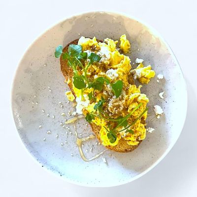 Fluffy scrambled eggs topped with goats cheese, dukkah and honey drizzle on sourdough (V)