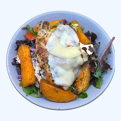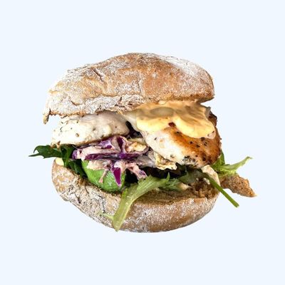 grilled chicken, avocado, slaw, melted provolone cheese, mix salad with mustard vinaigrette, side of chilli mayo & sweet potato wedges