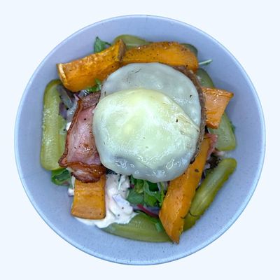 beef pattie, crispy bacon, melted provolone cheese, gherkins, mix salad with mustard vinaigrette, mustard burger mayo & sweet potato wedges