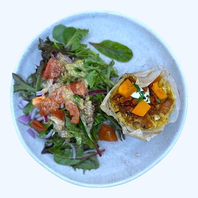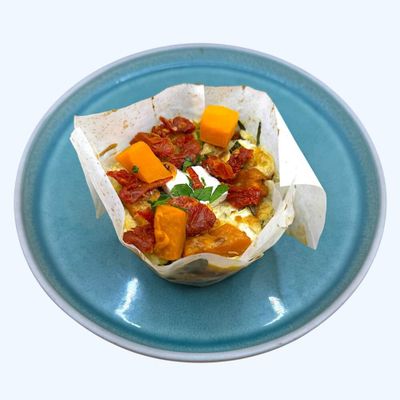 pumpkin, semi dried tomato, feta & basil with a side of mix salad (gf)