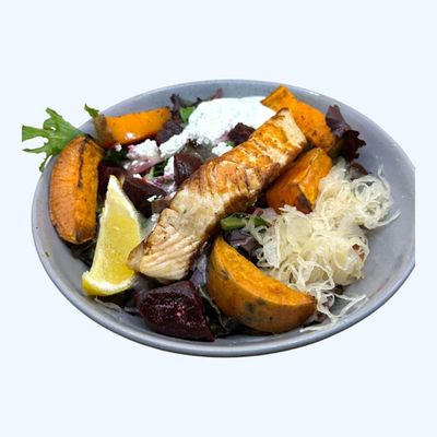 grilled salmon with a salad of mixed leaf, beetroot & feta, pickled cabbage, tzatziki, sweet potato wedges