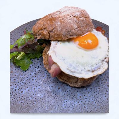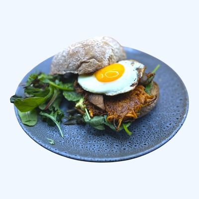 sweet potato rosti, avocado, spinach, mushroom, fried egg & relish on a whole meal damper roll (v)