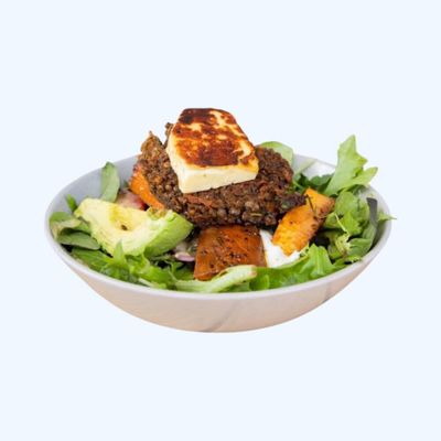 lentil & vege pattie with avocado, halloumi, tzatziki, beetroot hummus, mix salad with mustard vinaigrette & sweet potato wedges