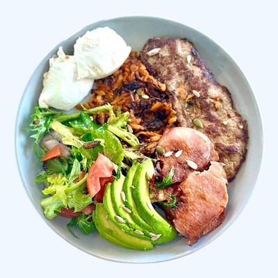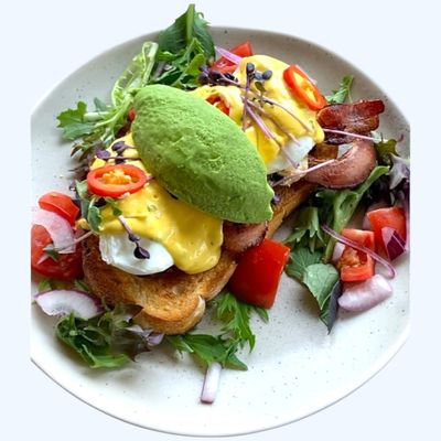 Grilled steak, poached eggs, bacon, salad toss,seeds, avocado served with a sweet pot rosti and aioli (gf)