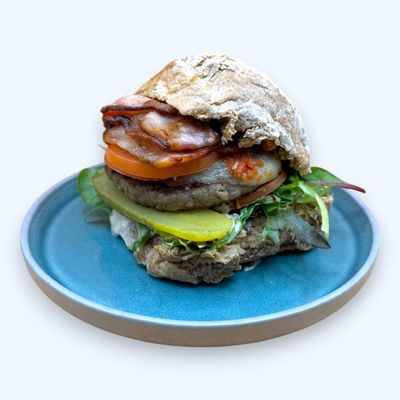 beef pattie, fresh tomato, caramelised onion, crispy bacon, lettuce, provolone cheese, tomato relish, side gherkin, mustard aioli