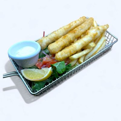 beer battered flat head with fries, side salad & homemade aioli sauce.