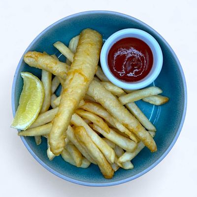 battered flathead & chips, side on tomato sauce.