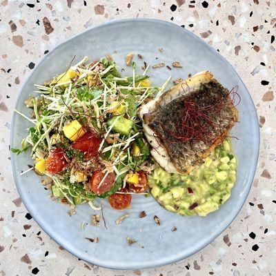 Served with a vibrant salad of mango, cucumber, cherry tomato, crispy onion & fresh herbs, tossed in a chili citrus-herb dressing — finished with a refreshing avocado & pineapple salsa.