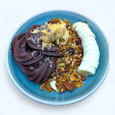 organic acai, topped with house made granola, cacao nibs, peanut butter, banana