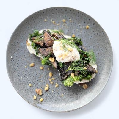 Marinated portobello mushrooms, herbs, kale, poached egg, walnuts served on toasted soy linseed bread & whipped stracciatella cheese (v)
