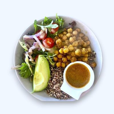 chickpeas coated in chilli & turmeric, avocado, quinoa, mix leaf salad, capsicum sauce