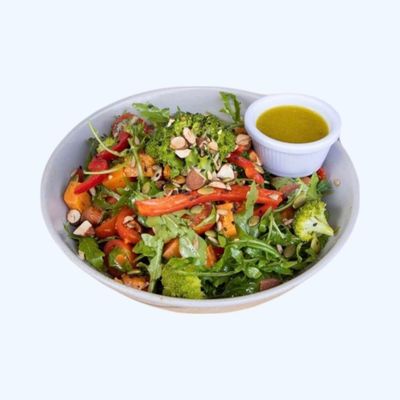 broccoli, pepitas, cherry tomatoes, sweet potato, mix leaf,kale, capsicum, crushed almonds topped with a herb dressing,