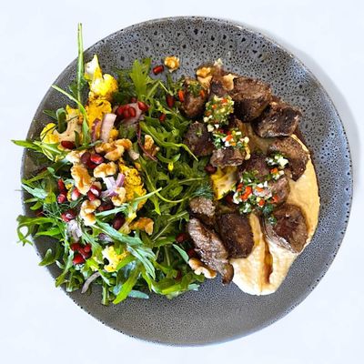 Grilled marinated Lamb drizzled with chimichurri, side roast cauliflower salad w rocket, pomegranate, walnuts, lemon & olive oil dressing, side of hummus.